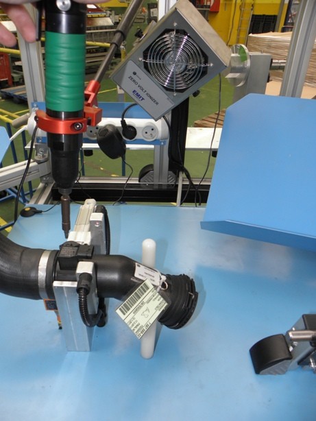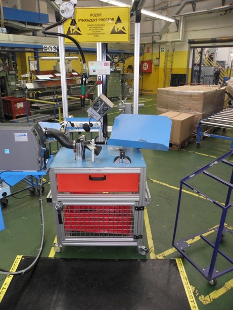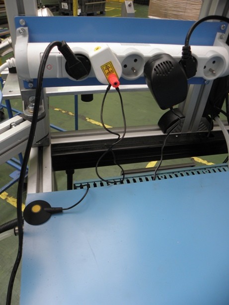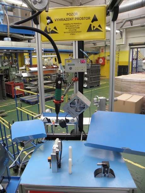 Na pracovišti by kromě uzemněné pracovní podložky a uzemnění operátora, nemělo chybět označení EPA prostoru. Na fotografii je k vidění jak podlahová páska, tak i výstražné návěstí EPA. Navíc je instalován i ionizátor vzduchu pro neutralizaci nábojů na pracovní ploše.